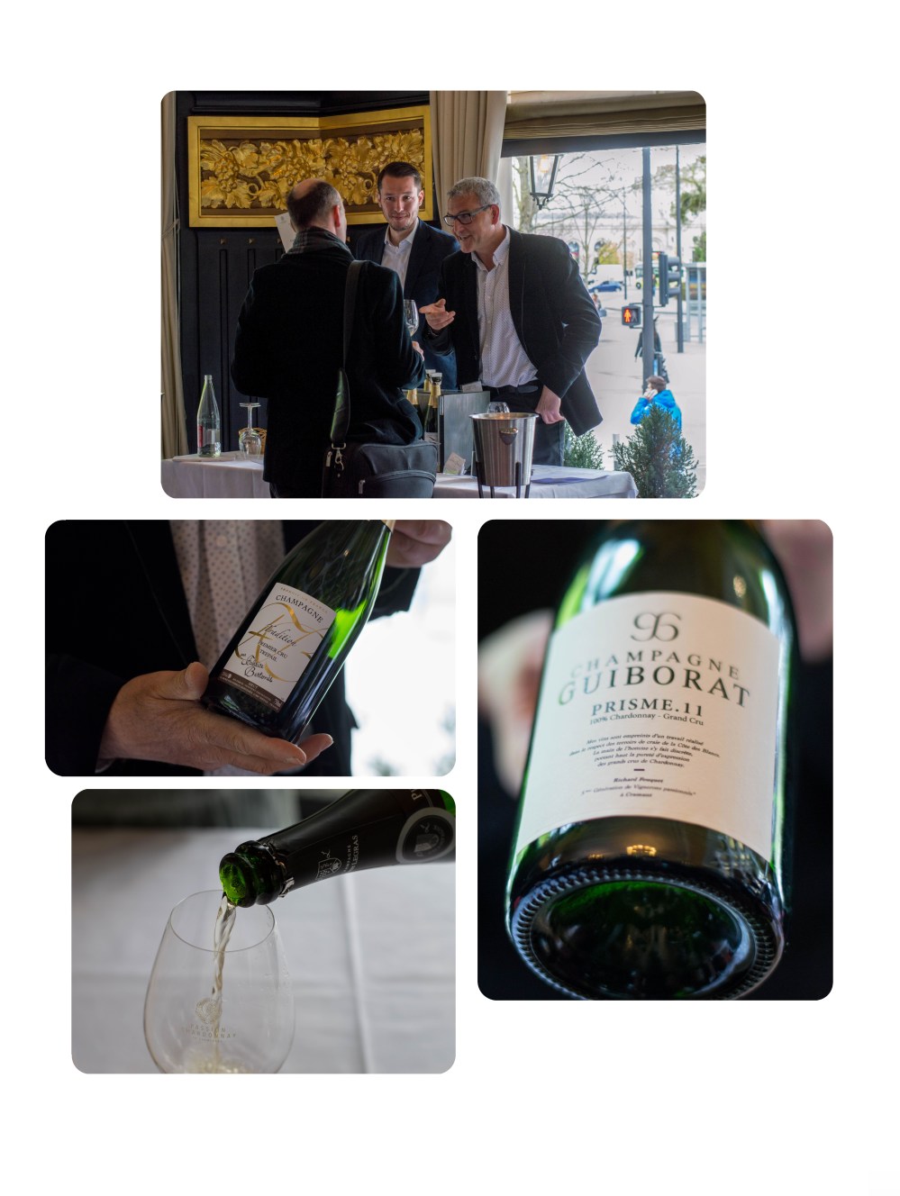 Located in the Côte des Blancs on the chalky terroir of the village of Cramant, Champagne Guiborat Fils is managed by Karine and Richard Fouquet. Richard represents the 5th generation of growers in charge of the 8-hectares family estate. The Prisme 11 cuvée – a Blanc de Blancs Grand Cru extra-brut wine from the 2011 harvest with 11% of reserve wines – is generous, fruity and complex with an elegant minerality whereas the 2010 vintage – a Blanc de Blancs Grand Cru extra-brut wine from 2010 harvest ; a year with a lack of sun and rain in august – is fresh and mineral with chlorophyl notes. To finish the tasting, the Prisme 06 cuvée in magnum – a Blanc de Blancs Grand Cru extra-brut champagne from the 2006 harvest with 12% of reserve wines – is delicate, complex and light with a nice, well-balanced and long finish.