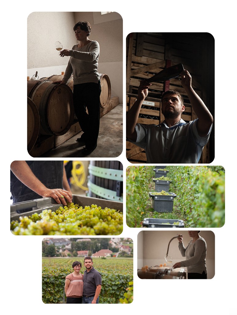 In the cellar, Aurélie guides and takes care of the wines with a lot of gentleness and in line with the work done in the vineyard. The aim is to preserve the richness that nature gives them. Each plot is worked separately, both in the press and during the vinification, in order to be able to express the best of the grapes. Stainless steel vats, oak barrels and demi-muids, make it possible to obtain a multitude of images of their plot, which gives Aurélie and Loïc the opportunity to create precise and characterful blends. During the vinification, the two winegrowers intervene as little as possible to let the wines evolve at their own pace, as peacefully as possible, and let nature express itself through them. As for the final touch – the disgorging – it is done manually, to respect both the tradition and the environment.